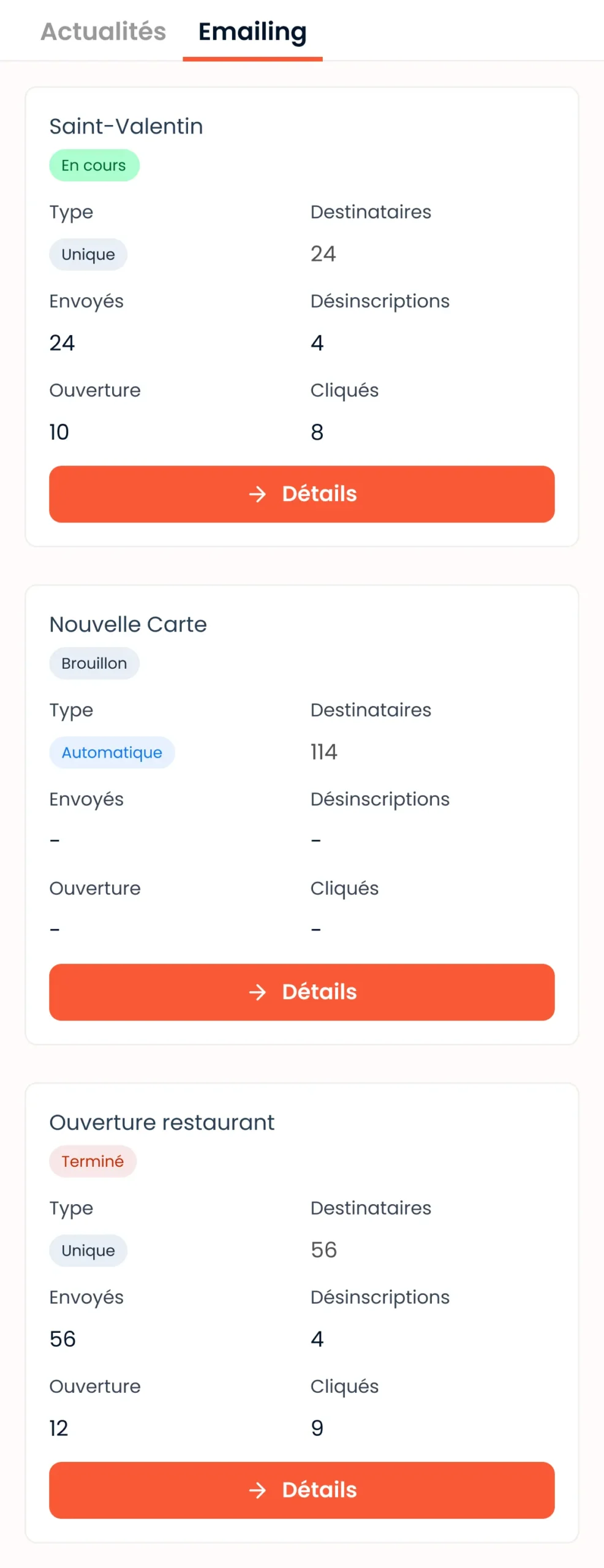 Lancez des campagnes email et SMS ciblées en quelques clics, avec des modèles pensés pour la restauration.