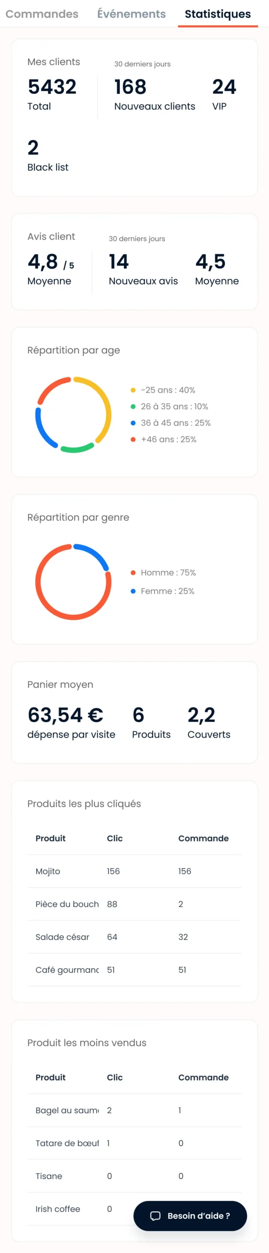 Comprenez qui sont vos clients : nouveaux, habitués, VIP, fréquence, panier moyen, provenance.